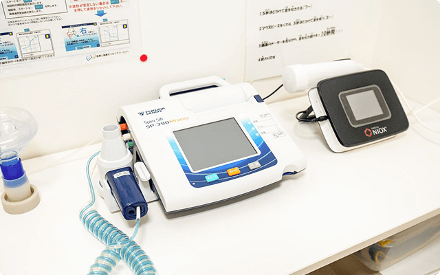 呼吸機能検査器械、呼気一酸化窒素(FeNO)測定機器を用いることにより、喘息の診断が可能です。