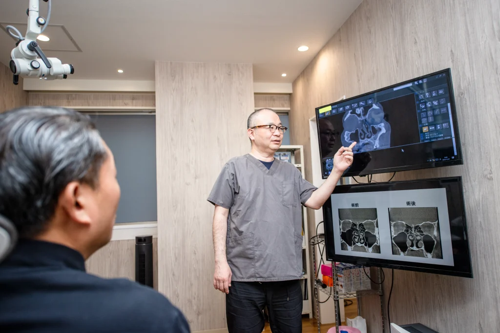 内視鏡やCTによる画像を活用し、症状の原因や鼻の構造、治療の選択肢を視覚的に丁寧にご説明。専門的な内容もできるだけ分かりやすい言葉でお伝えし、納得したうえで治療を選択していただける環境づくりを心がけています。
